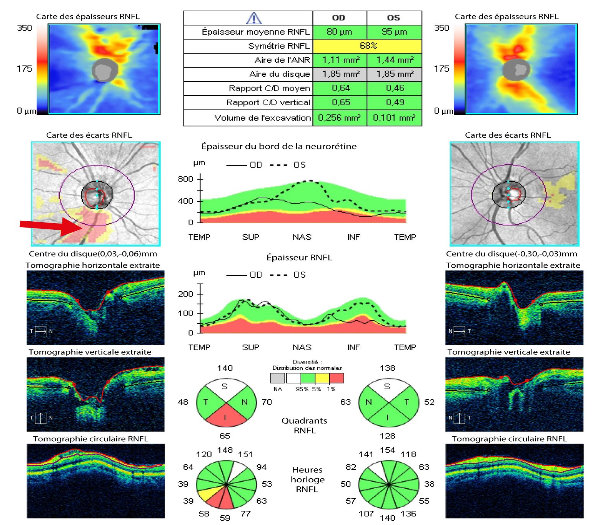 Tomographie par Cohérence Optique (Optical Coherence Tomography), un examen d'imagerie médicale non invasif et de haute précision, principalement utilisé en ophtalmologie pour visualiser les couches de la rétine, du nerf optique et de la cornée en coupes transversales, permettant de diagnostiquer et de suivre des maladies comme le glaucome, la DMLA ou le diabète. C'est une technique qui utilise la lumière infrarouge pour créer des images détaillées, comparables à des "échographies" de l'œil, et qui s'est étendue à la cardiologie pour l'imagerie vasculaire. .